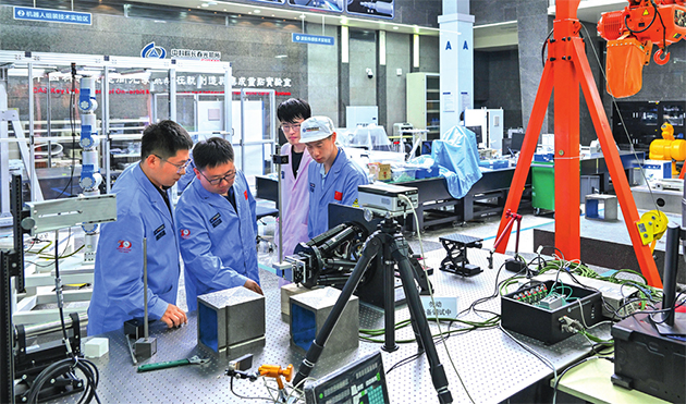 中國科學(xué)院空間光學(xué)系統(tǒng)在軌制造與集成重點(diǎn)實(shí)驗(yàn)室副主任徐振邦(左二)與同事在實(shí)驗(yàn)室內(nèi)討論科研工作(2023年5月25日攝) 許暢攝 / 本刊