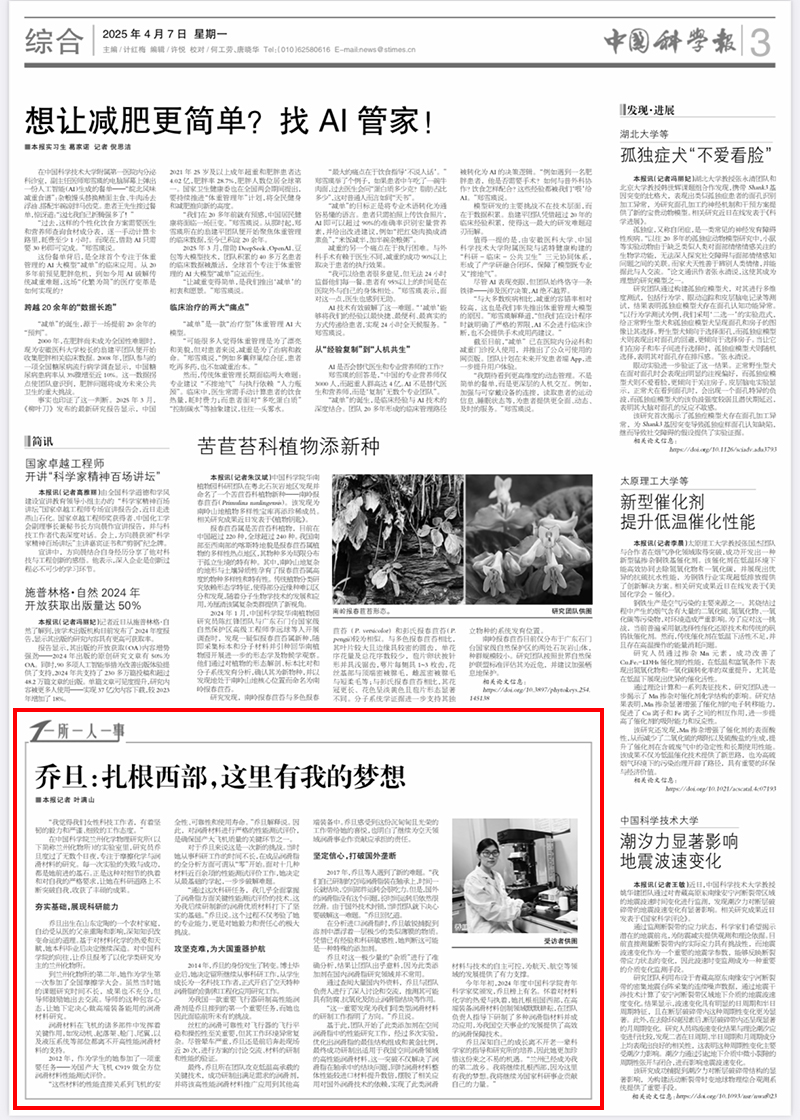 【中國科學報】喬旦:扎根西部,這里有我的夢想