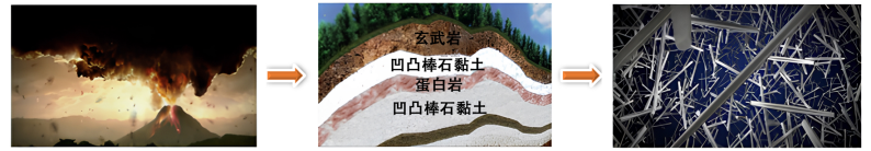 凹凸棒石的“分子身份證號”為Si8Mg5O20(OH)2(H2O)4·4H2O。它誕生于白堊紀(jì)至第三紀(jì)漫長的地質(zhì)演化過程中,是火山沉積、熱液蝕變與漫長風(fēng)化共同孕育的結(jié)晶。歷經(jīng)億萬年錘煉形成的獨(dú)特結(jié)構(gòu),至今仍是人類難以合成的自然杰作。