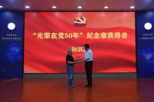 會議第二階段,在雄壯的國歌聲中,西北高原所召開慶祝建黨103周年表彰大會。楊勇剛宣讀了《中共中國科學(xué)院西北高原生物研究所委員會關(guān)于表彰先進(jìn)黨支部、優(yōu)秀共產(chǎn)黨員和優(yōu)秀黨務(wù)工作者的決定》。首先,所長陳世龍向?qū)O洪發(fā)同志頒發(fā)“光榮在黨50年”紀(jì)念章,代表所黨委向?qū)O洪發(fā)同志表示祝賀,并對他多年來為黨的事業(yè)盡心竭力、無私奉獻(xiàn)致以崇高的敬意。
