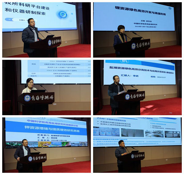 大會(huì)開(kāi)始,鄭詩(shī)禮副所長(zhǎng)(主持工作)首先介紹了召開(kāi)此次戰(zhàn)略研討會(huì)的背景和意義。隨后,李武研究員、樊啟順研究員、王敏研究員、葉秀深研究員、劉海寧研究員及副所長(zhǎng)馮海濤研究員圍繞鹽湖化學(xué)基礎(chǔ)研究、鉀資源增儲(chǔ)、鋰高效分離、鎂基結(jié)構(gòu)材料、鹽湖稀散元素和儀器設(shè)備平臺(tái)開(kāi)發(fā)六個(gè)方向分別以《鹽湖資源綠色高效分離技術(shù)與應(yīng)用示范項(xiàng)目-基礎(chǔ)部分》《鉀資源增儲(chǔ)與提質(zhì)增效研究思路》《鋰資源綠色高效開(kāi)發(fā)與高值利用》《強(qiáng)化關(guān)鍵科學(xué)與技術(shù)攻關(guān)加快推動(dòng)鹽湖鎂產(chǎn)業(yè)多元化高值化發(fā)展》《鹽湖銣銫溴碘硼高值元素資源增儲(chǔ)與分離提取》《青海鹽湖所科研平臺(tái)建設(shè)與儀器研制探索》為題作報(bào)告。