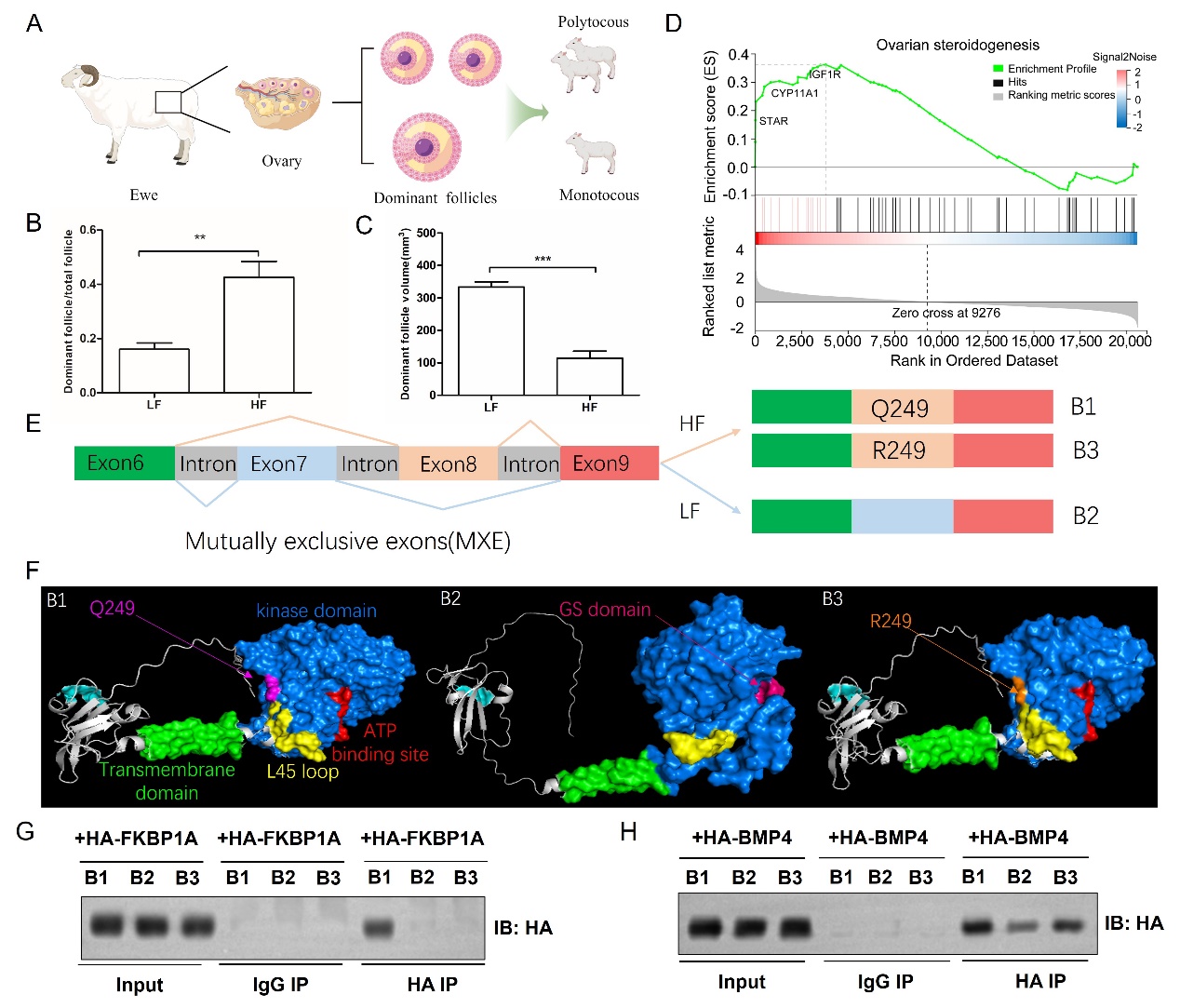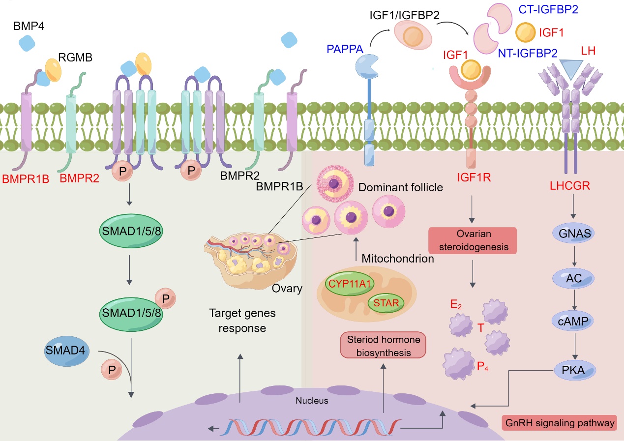 中國科學(xué)院西北高原生物研究所動(dòng)物生態(tài)與資源保護(hù)研究團(tuán)隊(duì)針對綿羊重要繁殖性狀(產(chǎn)羔數(shù)和產(chǎn)羔間隔),以連續(xù)三個(gè)產(chǎn)羔季節(jié)產(chǎn)多胎(每胎產(chǎn)兩羔或三羔,HF)和產(chǎn)單胎(每胎產(chǎn)一羔,LF)的藏羊?yàn)檠芯繉ο?,整合全基因組關(guān)聯(lián)分析、普通轉(zhuǎn)錄組學(xué)、單細(xì)胞轉(zhuǎn)錄組學(xué)、蛋白質(zhì)組學(xué)和代謝組學(xué)等多組學(xué)研究方法,結(jié)合KASP基因分型、實(shí)時(shí)熒光定量PCR、酶聯(lián)免疫吸附實(shí)驗(yàn)、免疫共沉淀和蛋白質(zhì)免疫印跡等分子功能驗(yàn)證實(shí)驗(yàn),挖掘藏羊產(chǎn)羔數(shù)和產(chǎn)羔間隔關(guān)鍵調(diào)控元件并揭示其高繁殖力的遺傳調(diào)控機(jī)制。全基因組關(guān)聯(lián)研究表明,BMPR1B基因與產(chǎn)羔數(shù)性狀相關(guān),PAPPA基因與產(chǎn)羔間隔性狀相關(guān)。首次構(gòu)建了藏羊卵巢單細(xì)胞圖譜,發(fā)現(xiàn)關(guān)鍵基因PAPPA特異性表達(dá)在壁層顆粒細(xì)胞亞群,且BMPR1B基因在壁層顆粒細(xì)胞和固醇生成顆粒亞群高表達(dá)?;趩渭?xì)胞轉(zhuǎn)錄組學(xué)、蛋白質(zhì)組學(xué)和代謝組學(xué)整合分析,發(fā)現(xiàn)PAPPA是刺激卵巢優(yōu)勢卵泡生長發(fā)育和類固醇生成的關(guān)鍵候選基因。繁殖主效基因BMPR1B除了非同義突變,首次在藏羊中發(fā)現(xiàn)BMPR1B還存在可變剪接事件調(diào)控多胎性狀。該研究結(jié)果對分子精準(zhǔn)選育提升藏羊繁殖力和實(shí)現(xiàn)藏羊產(chǎn)業(yè)提質(zhì)增效具有重要意義。