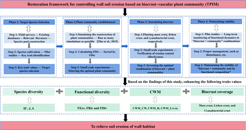研究發(fā)現(xiàn),維管束植物物種豐富度、物種多樣性、功能豐富度、群落加權(quán)平均和苔蘚結(jié)皮蓋度由土長城遺址頂部向下部顯著降低,且與土長城兩側(cè)土體侵蝕程度呈負(fù)相關(guān)(圖1),表明土長城本體較高的區(qū)域有利于維管束植物和生物結(jié)皮的定殖和生長。同時(shí),維管束植物和生物結(jié)皮的協(xié)同作用能有效緩解遺址本體遭受風(fēng)雨侵蝕(圖2)?;诖?,研究人員提出了基于生物結(jié)皮和維管束植物群落構(gòu)建目標(biāo)物種選擇、植物群落構(gòu)建、生物結(jié)皮接種和維持群落穩(wěn)定等增強(qiáng)土長城抗侵蝕的“修復(fù)框架”(圖3),為土長城遺址本體侵蝕防治提供了新思路。
