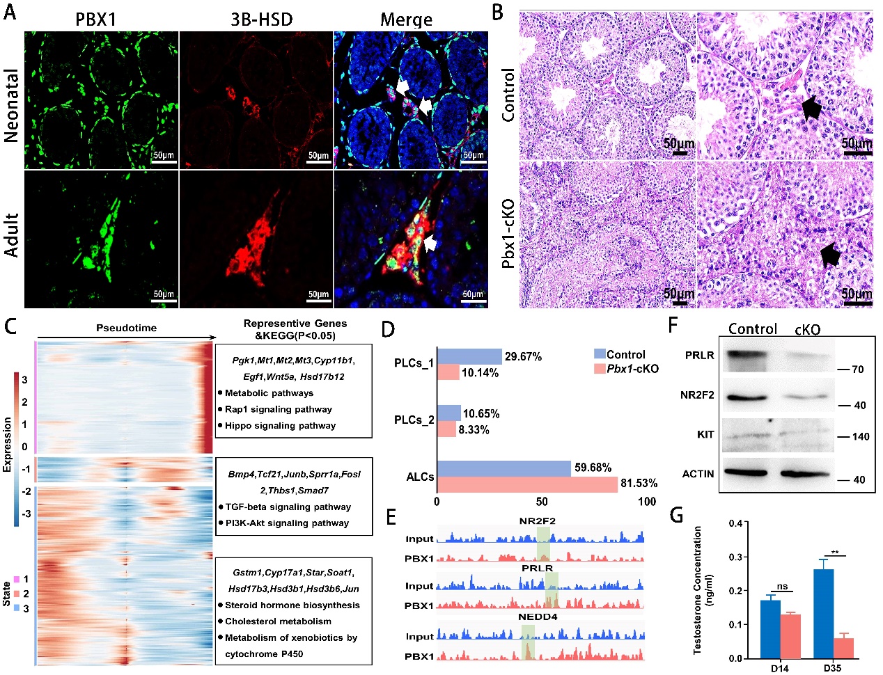 論文代表圖:A:轉(zhuǎn)錄因子PBX1在小鼠間質(zhì)細(xì)胞表達(dá);B:間質(zhì)細(xì)胞特異性敲除Pbx1導(dǎo)致曲精小管結(jié)構(gòu)完整性受損;C:Pbx1敲除導(dǎo)致間質(zhì)細(xì)胞基因表達(dá)異常;D: Pbx1敲除導(dǎo)致不同類型間質(zhì)細(xì)胞比例異常;E:ChIP-seq結(jié)果顯示PBX1和Nr2f、Prlp、Nedd4等類固醇合成關(guān)鍵基因的啟動(dòng)子區(qū)結(jié)合;F:Nr2f、Prlp、Kit蛋白在Pbx1敲除間質(zhì)細(xì)胞的表達(dá)水平低于對(duì)照;G:Pbx1敲除小鼠睪酮水平顯著降低。