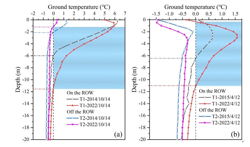 圖1? 2014-2022年中俄原油管道附近孔T1和天然孔T2暖季(a)和冷季(b)的地溫曲線?