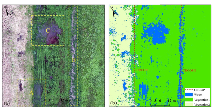 圖3 管道沿線積水分布 (a)無人機(jī)正射影像?。╞)影像監(jiān)督分類結(jié)果