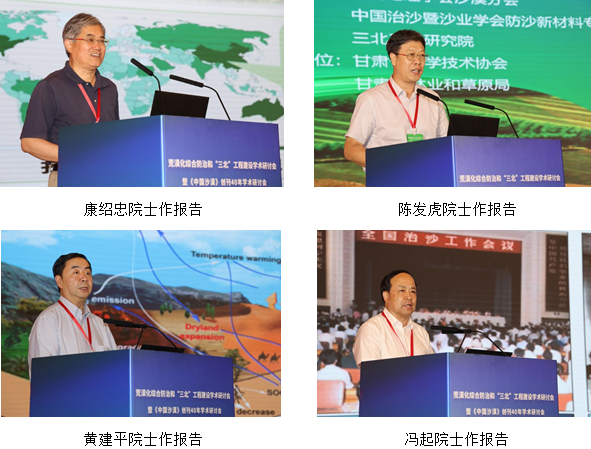 研討會以“荒漠化綜合防治和‘三北’工程建設(shè)”為主題,旨在深入學(xué)習(xí)貫徹落實習(xí)近平總書記關(guān)于加強荒漠化綜合防治和推進生態(tài)工程建設(shè)重要講話精神,推動山水林田湖草沙一體化保護和系統(tǒng)治理,總結(jié)和交流相關(guān)研究成果,促進人與自然和諧共生。大會邀請了丁一匯、姚檀棟、侯立安、鄭曉靜、康紹忠、陳發(fā)虎、黃建平、馮起、方小敏、朱教君等10位院士和王濤、李新榮、楊小平、董治寶、陳亞寧、鹿化煜、屈建軍、楊文斌等8位專家作主題報告,并組織了14個分論壇的專題報告。南志標(biāo)、賴遠(yuǎn)明、楊志峰院士參會??凳啦⒉軓V超、盧琦、李廣、勾曉華、楊興國分別主持大會主題報告。與會專家學(xué)者圍繞荒漠化綜合防治和“三北”工程建設(shè)的新理念、新技術(shù),深入探討了荒漠化地區(qū)氣候變化與生態(tài)系統(tǒng)響應(yīng)、荒漠生態(tài)修復(fù)與治理、全球氣候變化對西北暖濕化趨勢的影響等前沿問題。