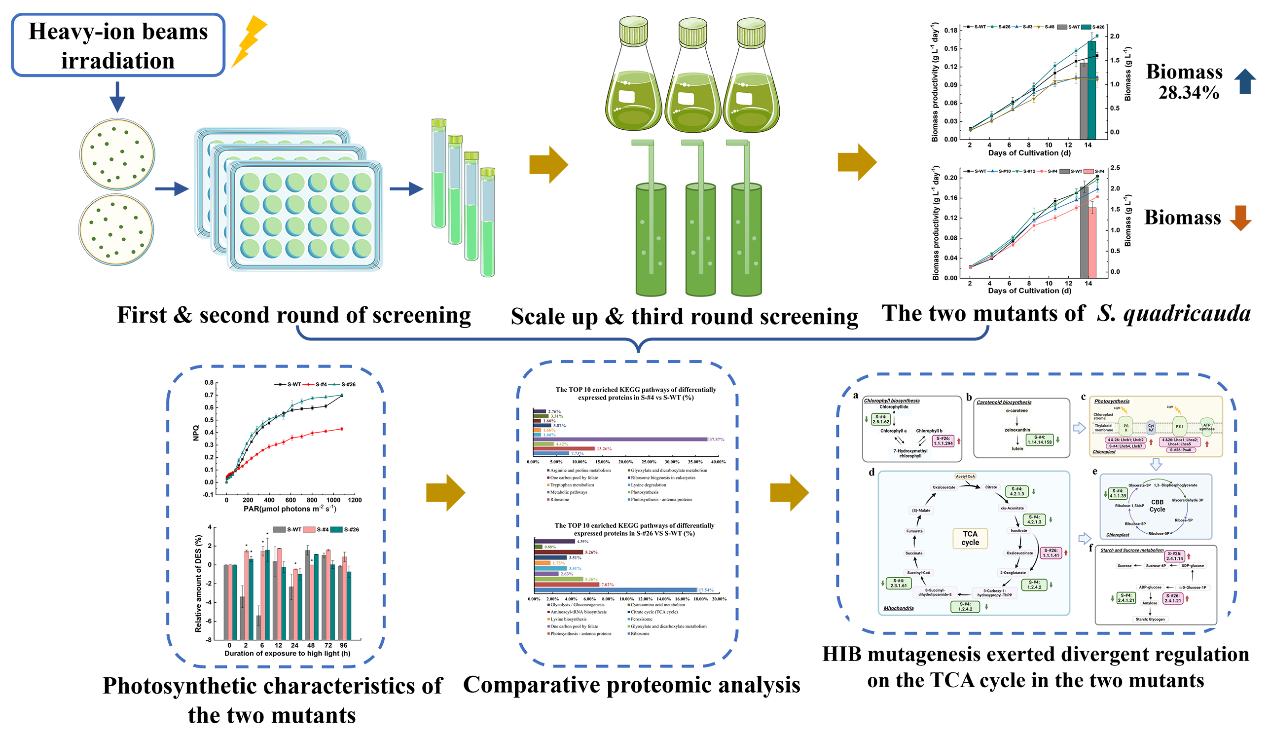 科研人員利用蘭州重離子研究裝置(HIRFL)提供的碳離子束,對環(huán)境適應(yīng)性強(qiáng)的四尾柵藻進(jìn)行了誘變選育,獲得了兩株光合特性、固碳能力與野生型對比鮮明的突變株;其中高固碳能力突變株生物量積累高于野生型的28.34?。?span lang="zh-CN" style="margin-top: 12px; margin-bottom: 12px; line-height: 1.5em; font-family: arial, helvetica, sans-serif; font-size: 16px;" data-index="9">,并且表現(xiàn)出對長時(shí)間高光脅迫的適應(yīng)性。通過對兩株突變株光合特征與比較蛋白組學(xué)的關(guān)聯(lián)分析,科研人員發(fā)現(xiàn)重離子束輻射誘導(dǎo)的中心碳代謝差異蛋白對突變株固碳能力強(qiáng)弱起到重要調(diào)控作用;另外,與突變株固碳能力關(guān)聯(lián)的三羧酸循環(huán)差異調(diào)控,為高效固碳微藻工程株選育提供了潛在靶點(diǎn)。