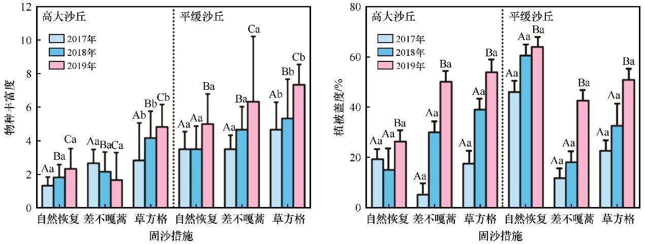 土壤性狀改善和植物群落重建是沙漠化防治取得成效的重要表征,明晰不同沙漠化防治措施下植物群落與土壤因子的變化趨勢及關聯(lián)特征,有助于篩選最佳的沙漠化治理措施。