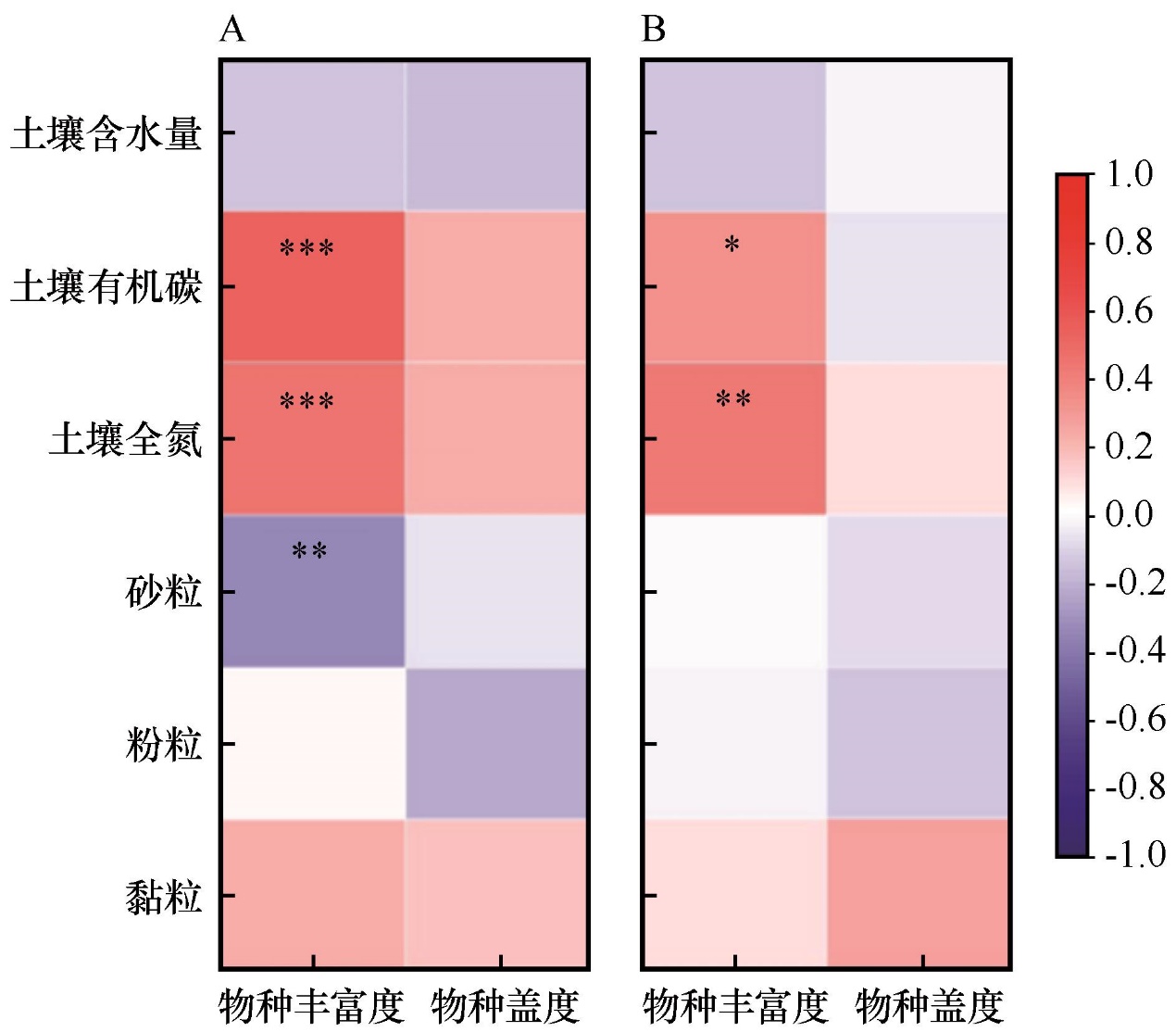 圖2 高大(A)和平緩(B)流動沙丘土壤理化性質與植被群落特征相關性分析