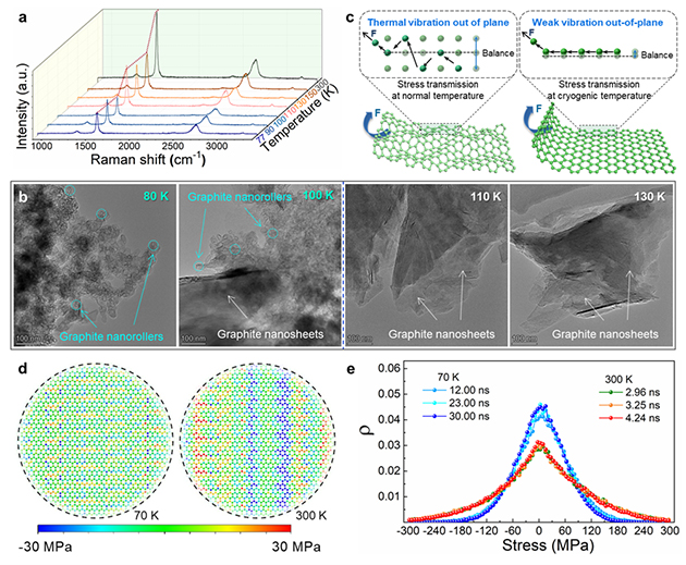 結(jié)合實(shí)驗(yàn)和理論模擬系統(tǒng),研究團(tuán)隊(duì)研究了石墨納米片邊緣自卷翹形變的影響因素、結(jié)構(gòu)演變和形成機(jī)理。結(jié)果表明,超低溫環(huán)境下,非平衡溫度場導(dǎo)致了原子的不均勻收縮,石墨片上下表面產(chǎn)生了方向相反的應(yīng)力,驅(qū)動(dòng)了石墨片邊緣的自卷翹;同時(shí)發(fā)現(xiàn)熱振動(dòng)對原子間應(yīng)力傳遞的耗散作用,當(dāng)溫度低于100K時(shí),原子熱振動(dòng)顯著減弱,原子間應(yīng)力傳遞耗散被抑制,促進(jìn)了石墨納米片自卷翹形變的發(fā)生。該研究將為認(rèn)識(shí)微觀粒子受力傳遞規(guī)律和納米形變機(jī)理提供新的理解,同時(shí)發(fā)現(xiàn)了一種利用溫度操控自卷曲納米形變行為的新方法,在潤滑、傳感等眾多領(lǐng)域具有廣泛應(yīng)用價(jià)值。