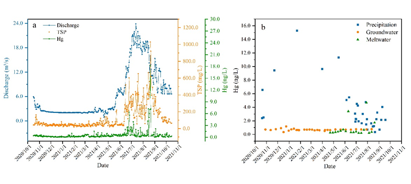 研究發(fā)現(xiàn),季風(fēng)期冰川徑流中總汞濃度高于非季風(fēng)期。季風(fēng)期冰川徑流中的總汞濃度與總懸浮顆粒物(TSP)、溶解有機碳(DOC)和溶解無機碳(DIC)呈現(xiàn)顯著正相關(guān)(p?。肌?.001),非季風(fēng)期徑流中的總汞與TSP、流量、溫度和降水量顯著正相關(guān)(p?。肌?.001),與DIC呈現(xiàn)負相關(guān)關(guān)系(p < 0.01),表明冰川徑流中總汞濃度受到氣象、水文過程和其它環(huán)境因子的共同影響。