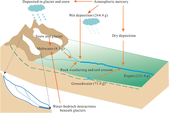 明永河流域總汞輸入通量為343.8克/年,冰雪融水、大氣降水和地下水分別貢獻了2.4%、76.9%和20.7%。冰川主要通過以下兩種途徑影響徑流中的汞,一是冰川消融過程釋放被封存在冰中的歷史汞;二是消融期冰下侵蝕加劇,冰下水-巖相互作用是冰川徑流中汞的重要來源之一。明永河流域冰川徑流總汞輸出通量為211.0克/年,表明該流域為汞匯。據(jù)估計,青藏高原冰川徑流中總汞輸出通量約947.7千克/年。本研究證實,青藏高原冰川消融對區(qū)域水生生態(tài)系統(tǒng)中汞循環(huán)的影響不容忽視。