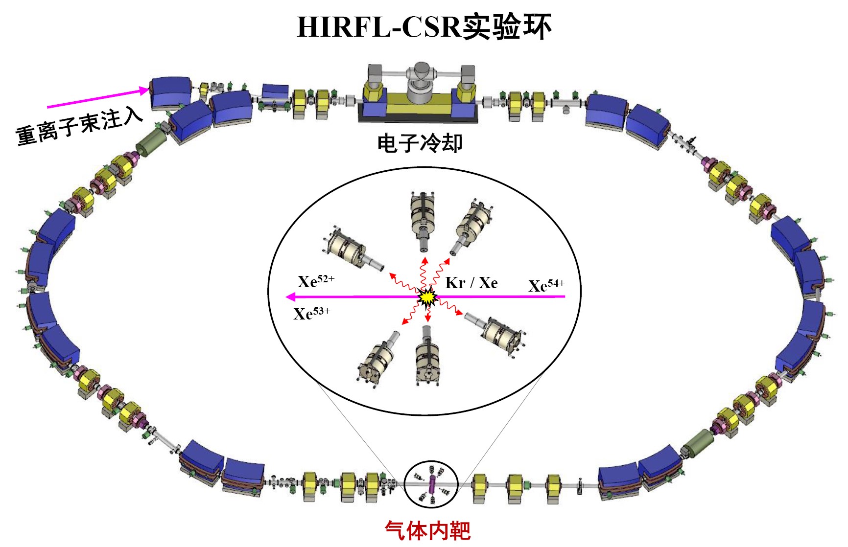 圖:在HIRFL-CSR實(shí)驗(yàn)環(huán)上開展高能Xe54+離子與Kr和Xe原子碰撞中非輻射電子俘獲精細(xì)X射線譜的實(shí)驗(yàn)裝置示意圖
