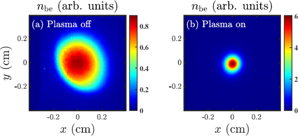 實(shí)驗(yàn)中,基于高能電子成像實(shí)驗(yàn)平臺,科研人員利用熱陰極微波電子槍產(chǎn)生的電子束及高壓直流放電等離子體靶,成功觀察到電子束在有源等離子體透鏡中的聚焦現(xiàn)象,同時(shí)對其聚焦原理深入分析。實(shí)驗(yàn)結(jié)果表明(圖1):當(dāng)?shù)入x子體靶不放電時(shí),YAG屏上的束斑為1.25 mm,而該靶調(diào)節(jié)至合適的放電電壓和氣壓后,束斑減小至0.48mm,聚焦效果顯著!