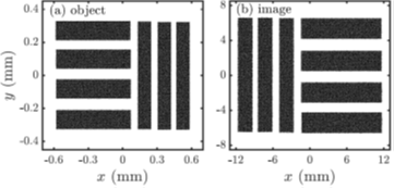 鑒于有源等離子體透鏡具有緊湊、聚焦梯度大、對稱聚焦、色差小的優(yōu)勢,科研人員將該透鏡成功應(yīng)用到高能電子成像中。從高能電子束在透鏡中的傳輸矩陣出發(fā),科研人員設(shè)計(jì)了一個(gè)總長為44.87cm、放大倍數(shù)為20的高能電子成像系統(tǒng),其點(diǎn)對點(diǎn)成像模擬結(jié)果如圖2所示。模擬結(jié)果表明:該系統(tǒng)的成像分辨率可以達(dá)到亞微米量級,相較于基于電磁四極鐵的全長為5m(放大倍數(shù)為10)的成像系統(tǒng)十分緊湊。