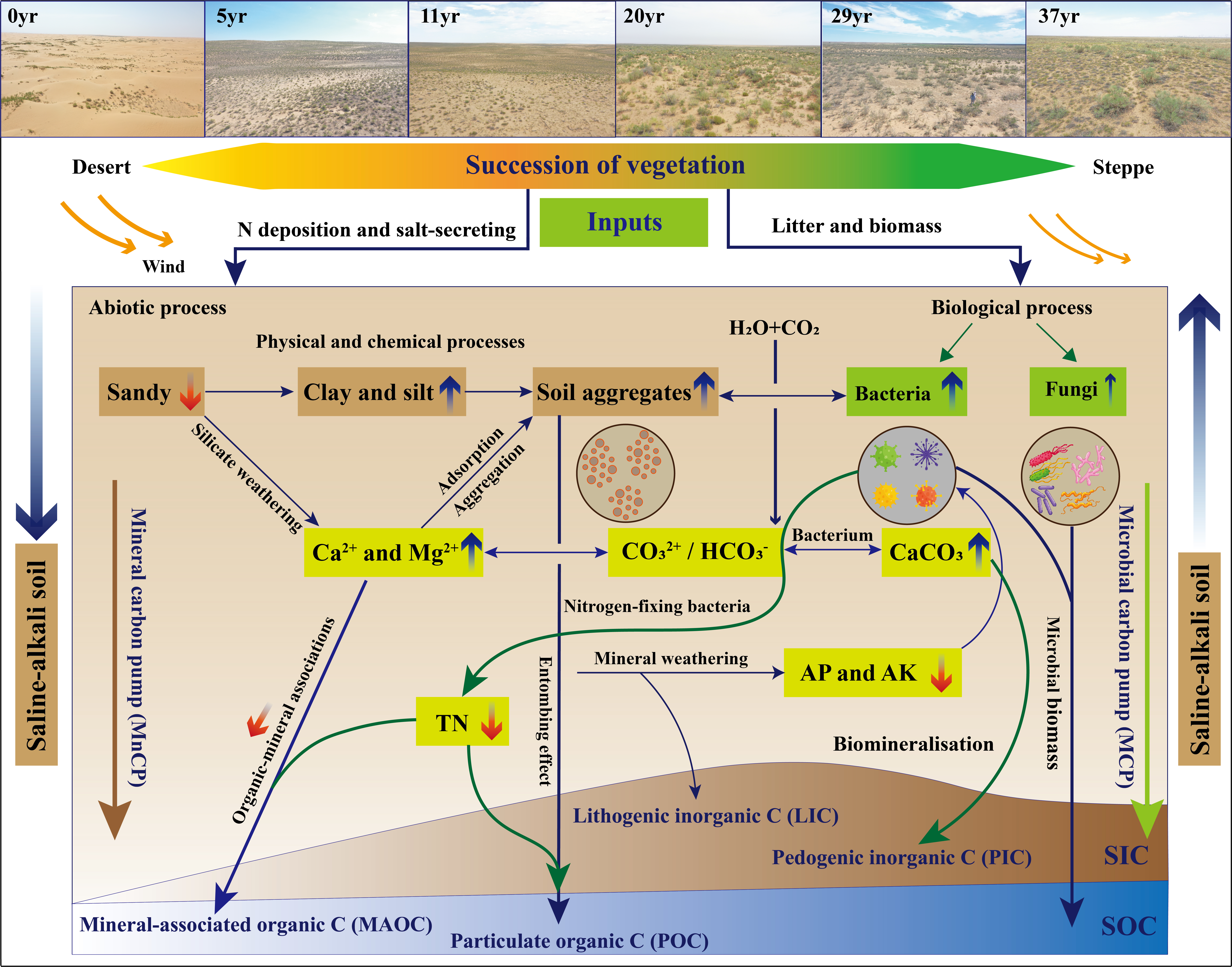 土壤有機(jī)碳(SOC)含量及變化是土壤健康評估的重要指標(biāo)。但對于以鹽堿土為主的荒漠區(qū)而言,土壤無機(jī)碳(SIC)含量及變化對生態(tài)系統(tǒng)的健康和穩(wěn)定同樣重要。以往研究表明:人工造林顯著增加了土壤SOC和SIC含量,但對SOC和SIC變化的影響因素及生物和非生物因素的理解還存在不足。因此,研究荒漠區(qū)人工固沙植被群落土壤碳含量變化及影響機(jī)理對于沙漠化防治技術(shù)提升、沙漠邊緣阻擊戰(zhàn)順利實施及我國北方防沙帶建設(shè)等具有重要意義。