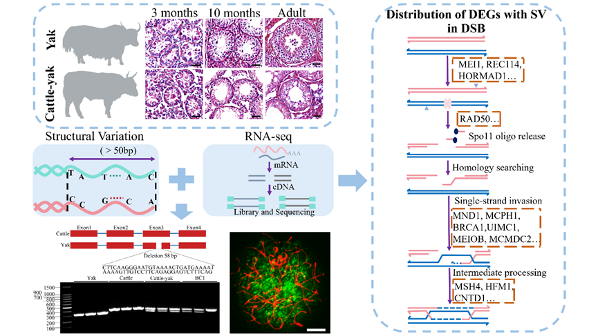 中國(guó)科學(xué)院西北高原生物研究所動(dòng)物生態(tài)與資源保護(hù)研究團(tuán)隊(duì)通過(guò)整合牦牛和普通?;蚪MSV位點(diǎn)信息和轉(zhuǎn)錄組數(shù)據(jù),對(duì)牦牛、犏牛和回交一代(BC1)睪丸組織在幾個(gè)關(guān)鍵發(fā)育階段的組織學(xué)特征、轉(zhuǎn)錄組圖譜以及SV在差異表達(dá)基因(DEGs)中的分布進(jìn)行了表征。結(jié)果發(fā)現(xiàn),在犏牛睪丸組織中,與精原細(xì)胞命運(yùn)決定、減數(shù)分裂重組和DSB修復(fù)等過(guò)程相關(guān)的基因表達(dá)下調(diào),且在每個(gè)發(fā)育階段犏牛中均有一定比例的DEGs含有SV。比如,3月齡犏牛27.78%的DEGs(50/180)中分布有180個(gè)SV,其中大部分SV(147/180)位于內(nèi)含子區(qū);10月齡犏牛27.73%的DEGs(1750/6310)中分布有8741個(gè)SV,其中大部分SV位于內(nèi)含子區(qū)(7640/8741),少量的SV位于外顯子區(qū)(50/8741)和UTR區(qū)(18/8741)等,這些SV可能會(huì)影響基因的表達(dá)。對(duì)其中的候選基因ESCO2BRDT進(jìn)行了表達(dá)驗(yàn)證,發(fā)現(xiàn)ESCO2在牦牛和犏牛精母細(xì)胞細(xì)線期表達(dá),BRDT在牦牛精母細(xì)胞偶線期和粗線期表達(dá),但在犏牛中只在偶線期表達(dá)。相較于牦牛,犏牛中ESCO2BRDT的表達(dá)均下調(diào)。此外,還發(fā)現(xiàn)差異表達(dá)的X連鎖基因在10月齡(123/252)和成年(206/274)的犏牛中多數(shù)表達(dá)上調(diào),這可能與減數(shù)分裂性染色體失活(MSCI)異常有關(guān),凸顯了 X 染色體在雜交不育中的作用。然而,相較于犏牛無(wú)法產(chǎn)生精子,BC1曲細(xì)精管中出現(xiàn)了少量的圓形精子,并且與精子形成相關(guān)的基因(TSSK6, TSKS, TBC1D21, TPPP2, SPPL2C等)表達(dá)上調(diào),但仍低于牦牛正常精子發(fā)生水平,表明精子發(fā)生缺陷和基因表達(dá)異常在BC1中得到了部分恢復(fù)。本研究獲得了牦牛和犏牛在關(guān)鍵發(fā)育階段的DEGs 和SV位點(diǎn)信息,為了解SV在犏牛雄性不育以及物種雜交不育中的潛在功能提供了啟示。
