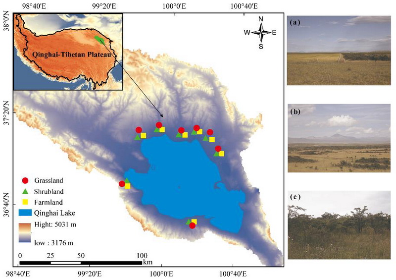 中國(guó)科學(xué)院西北高原生物研究所高原藥用資源生態(tài)保護(hù)與繁育學(xué)科團(tuán)隊(duì)在環(huán)青海湖區(qū)域分別選擇高寒草原、農(nóng)田、人工灌叢為研究對(duì)象,構(gòu)建了從天然草原—農(nóng)田—人工灌叢的土地利用類型轉(zhuǎn)化序列,測(cè)定了初級(jí)生產(chǎn)力、土壤真菌和細(xì)菌以及土壤因子。研究表明:隨著農(nóng)田向人工灌叢的轉(zhuǎn)化土壤環(huán)境因子和微生物群落組成呈現(xiàn)出逐漸向天然草地恢復(fù)的趨勢(shì),土壤磷含量對(duì)土壤微生物群落組成的恢復(fù)發(fā)揮關(guān)鍵調(diào)節(jié)作用。退耕還林后土壤微生物共生網(wǎng)絡(luò)復(fù)雜性的恢復(fù)比微生物群落組成和功能類群的恢復(fù)需要更長(zhǎng)的時(shí)間。最重要的是,本研究揭示了土壤微生物共生網(wǎng)絡(luò)復(fù)雜性在土地利用變化過程中介導(dǎo)初級(jí)生產(chǎn)力對(duì)土壤多功能性的影響。這些發(fā)現(xiàn)彌補(bǔ)了我們對(duì)咸水湖生境周圍土地利用變化過程認(rèn)識(shí)的不足,對(duì)于拓寬我們對(duì)土地利用變化的認(rèn)識(shí),促進(jìn)全球高寒生態(tài)系統(tǒng)恢復(fù)決策的制定具有重要意義。