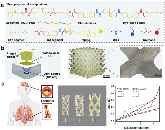 研究人員通過在聚氨酯前驅(qū)體中引入了脲基和酯基,發(fā)展了多重氫鍵誘導的可快速光固化3D打印的超分子聚氨酯彈性體,獲得的彈性體具有優(yōu)異的高彈性、高強度、韌性以及良好的生物相容性和血液相容性。具有高精度光固化3D打印性能的聚氨酯彈性體綜合了高性能與快速結(jié)構(gòu)制造方面的優(yōu)勢,為具有優(yōu)異抗壓縮承載能力和機械穩(wěn)定性等特性的復雜柔性結(jié)構(gòu)生物醫(yī)療器械的制造提供了新的材料技術(shù)方案。