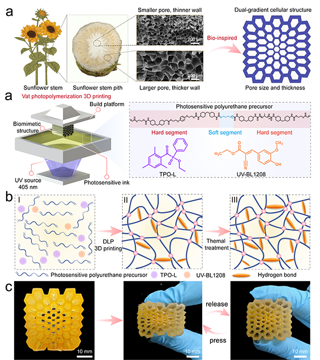 相關(guān)研究成果分別以“Multiple H-bonds Induced Mechanically Robust Vat Photopolymerization 3D Printing Poly(urethane-urea) Elastomers”和“Sunflower Pith Inspired Dual-Gradient Cellular Polyurethane Architecture with Amplified Mechanical Functions”為題發(fā)表在Materials Horizons(Materials Horizons,2024,https://doi.org/10.1039/D4MH01191K)和Chemical Engineering Journal(Chemical Engineering Journal,2024,500,156740)上。石河子大學聯(lián)培博士生楊星星和中國科學院大學博士生白常成分別為論文第一作者,蘭州化物所劉德勝助理研究員和王曉龍研究員為共同通訊作者。