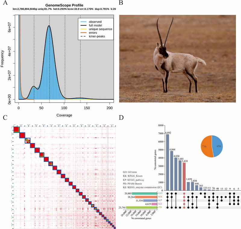 中國科學(xué)院西北高原生物研究所動物生態(tài)與資源保護(hù)研究團(tuán)隊聯(lián)合青海大學(xué),基于PacBio HiFi三代基因組測序、Hi-C測序和DNBSEQ-T7二代基因組survey測序三種測序技術(shù),成功組裝了藏羚染色體級別的基因組。結(jié)果顯示,藏羚基因組大小為3.1 Gb,Contig N50為84.6 Mb,所有基因掛載到30條染色體上(29?。),與之前的核型研究一致。數(shù)據(jù)評估顯示,藏羚基因組BUSCO得分為98.2%(S:92.3%,D:5.9%,F(xiàn):0.8%,M:1.0%),平均QV值為70.14,表明組裝的連續(xù)性好,完整度和準(zhǔn)確性高?;贓DTA和RepeatModeler從頭預(yù)測的藏羚基因組中重復(fù)序列注釋結(jié)果表明,藏羚基因組重復(fù)序列主要由SINEs、LINEs、LTRs 和DNA transposons四種類型組成,序列總長度為1.65 Gb,占基因組的52.47%;基于蛋白同源預(yù)測、蛋白從頭預(yù)測和深度學(xué)習(xí)等多種策略,在藏羚基因組上共注釋到28,330個功能基因。綜上,通過多種技術(shù)手段,首次獲得了藏羚染色體水平的高質(zhì)量基因組和注釋信息,為藏羚的適應(yīng)進(jìn)化遺傳機(jī)制、保護(hù)遺傳學(xué)研究及進(jìn)一步探索物種遷徙行為的遺傳機(jī)制提供了重要的基因組資源。