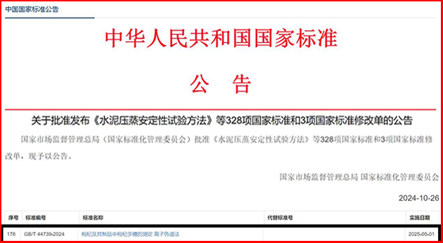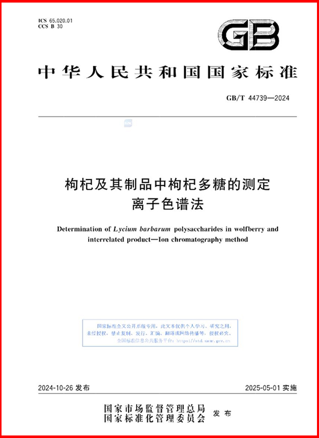 該團(tuán)隊(duì)自2019年起,以枸杞多糖為研究對(duì)象,開(kāi)展了枸杞多糖含量分析新方法的研究和國(guó)家標(biāo)準(zhǔn)的制訂。10月26日,由蘭州化物所牽頭、寧夏回族自治區(qū)藥品檢驗(yàn)研究院等單位參與制訂的國(guó)家標(biāo)準(zhǔn)《枸杞及其制品中枸杞多糖的測(cè)定 離子色譜法》(GB/T 44739-2024),由國(guó)家市場(chǎng)監(jiān)督管理總局(國(guó)家標(biāo)準(zhǔn)化管理委員會(huì))批準(zhǔn)發(fā)布,將于2025年5月1日正式實(shí)施。
