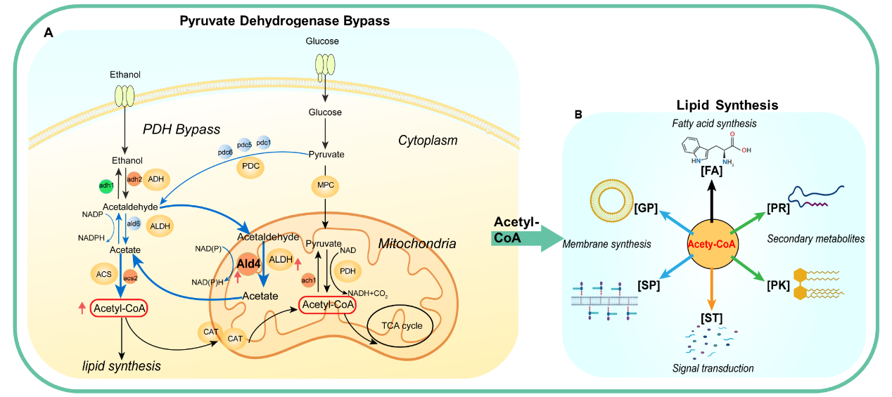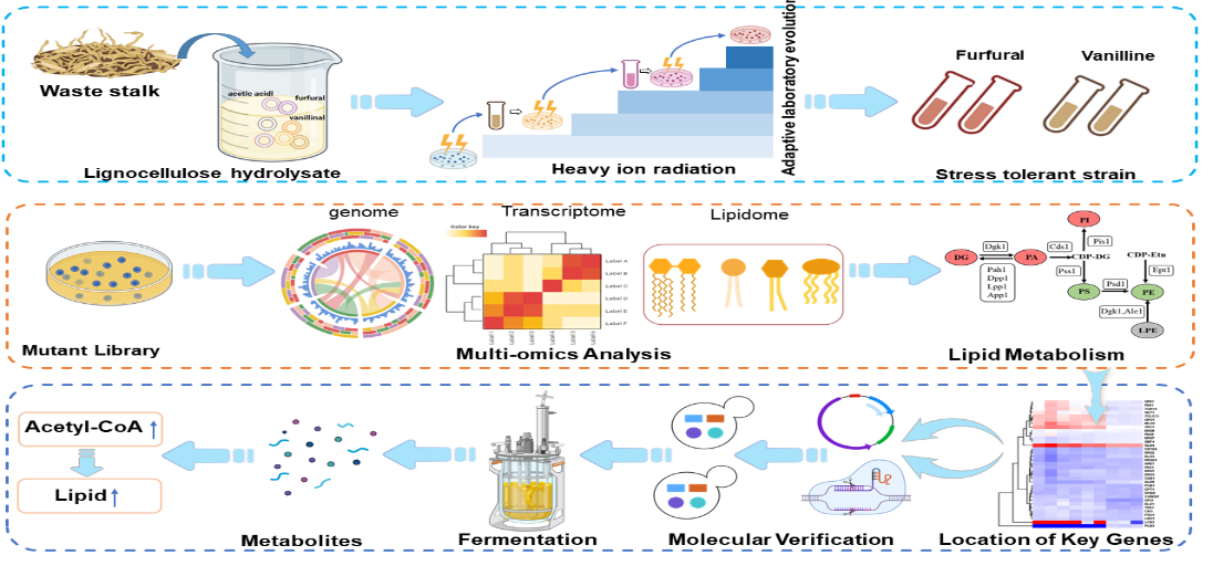 基于此現(xiàn)狀,科研人員利用蘭州重離子加速器(HIRFL)對(duì)目標(biāo)突變體實(shí)施多輪輻射,結(jié)合ALE技術(shù)提高了酵母的抗逆性和耐受性,因此獲得了適應(yīng)性更強(qiáng)的底盤細(xì)胞。再通過(guò)多組學(xué)聯(lián)合分析方法識(shí)別出與其發(fā)酵性能相關(guān)的重要基因,利用基因編輯技術(shù)對(duì)代謝通路進(jìn)行精準(zhǔn)優(yōu)化,著重優(yōu)化了核心代謝中間產(chǎn)物的代謝通量,使乙酰輔酶A水平較之前提高了17.10%,從而顯著提高了酵母在合成脂類和其他高附加值化合物方面的產(chǎn)量。
