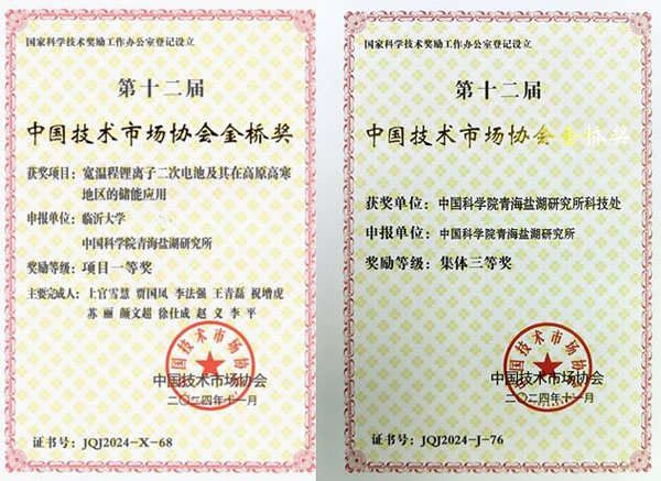 12月14日,由中國(guó)技術(shù)市場(chǎng)協(xié)會(huì)主辦的第十二屆中國(guó)技術(shù)市場(chǎng)協(xié)會(huì)金橋獎(jiǎng)表彰獎(jiǎng)勵(lì)大會(huì)在北京舉行,中國(guó)科學(xué)院青海鹽湖研究所獲項(xiàng)目獎(jiǎng)1項(xiàng)、集體獎(jiǎng)1項(xiàng)?!皩挏爻啼囯x子二次電池及其在高原高寒地區(qū)的儲(chǔ)能應(yīng)用”項(xiàng)目獲“項(xiàng)目一等獎(jiǎng)”,科技處獲“集體三等獎(jiǎng)”。