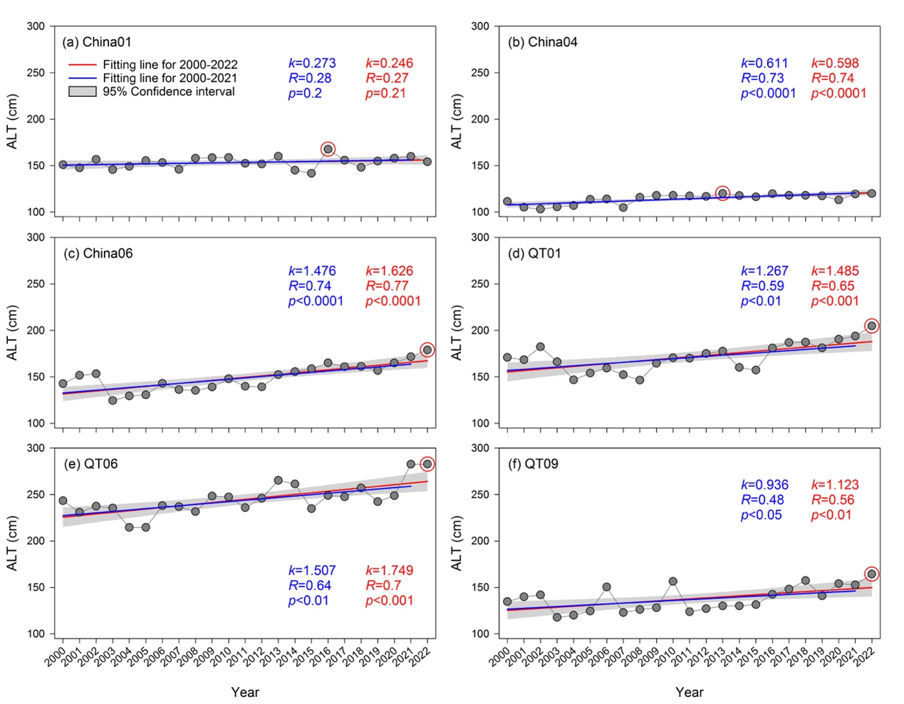 圖2 2000-2022年研究區(qū)6個活動層監(jiān)測點的活動層厚度的時間變化