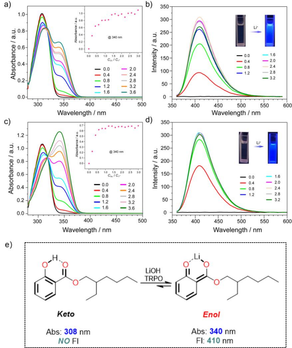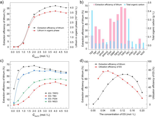 中國科學(xué)院青海鹽湖研究所研究團(tuán)隊(duì)對2-乙基己基水楊酸(ES)和三烷基磷酸氧化物(TRPO)混合萃取體系進(jìn)行了平衡、過程和機(jī)理研究。系統(tǒng)研究了影響鋰萃取的因素,如有機(jī)相組成、水相條件、萃取時間和ES萃取系統(tǒng)的酸堿耐受性。通過平衡研究,設(shè)計了從碳酸鋰母液中回收鋰的整個過程,包括萃取、洗滌、剝離和再生,并成功回收了99%的鋰,得到了含25.85 g/L鋰和0.08 g/L鈉的鋰富集溶液。研究表明,萃取過程是熱力學(xué)自發(fā)的熵增過程,在分子水平上,通過紫外-可見光譜(UV–Vis)、熒光光譜(Fl)、核磁共振(1H NMR)和傅里葉變換紅外光譜(FT-IR)闡明了配位機(jī)制。