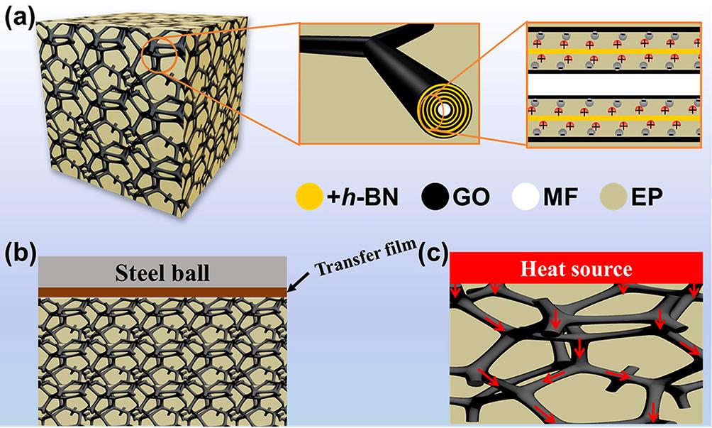 圖1.(a) GBS@polymer復合材料結構示意圖。GBS@polymer復合材料(b)摩擦學和(c)熱傳導機理示意圖。