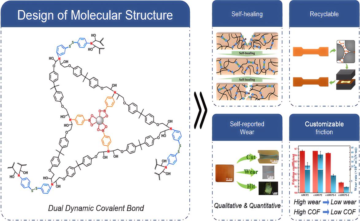 圖2.基于雙動態(tài)共價交聯(lián)的多功能聚合物設計,包括自愈合、可回收、自報告磨損和可定制摩擦性能。