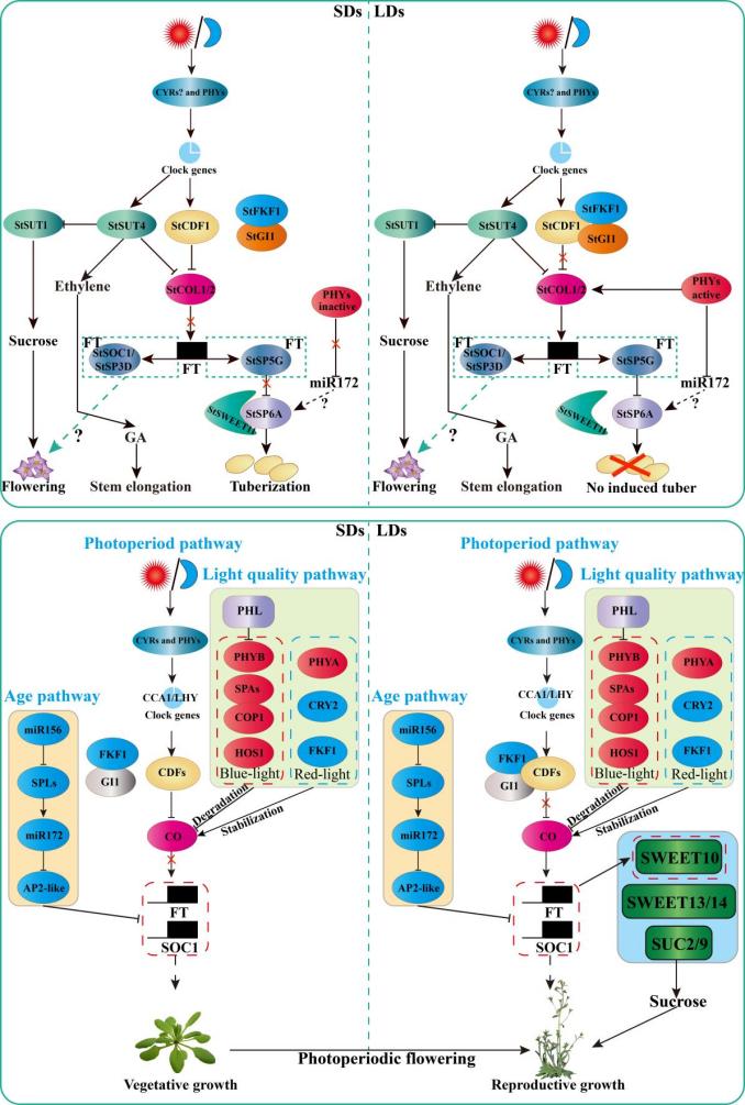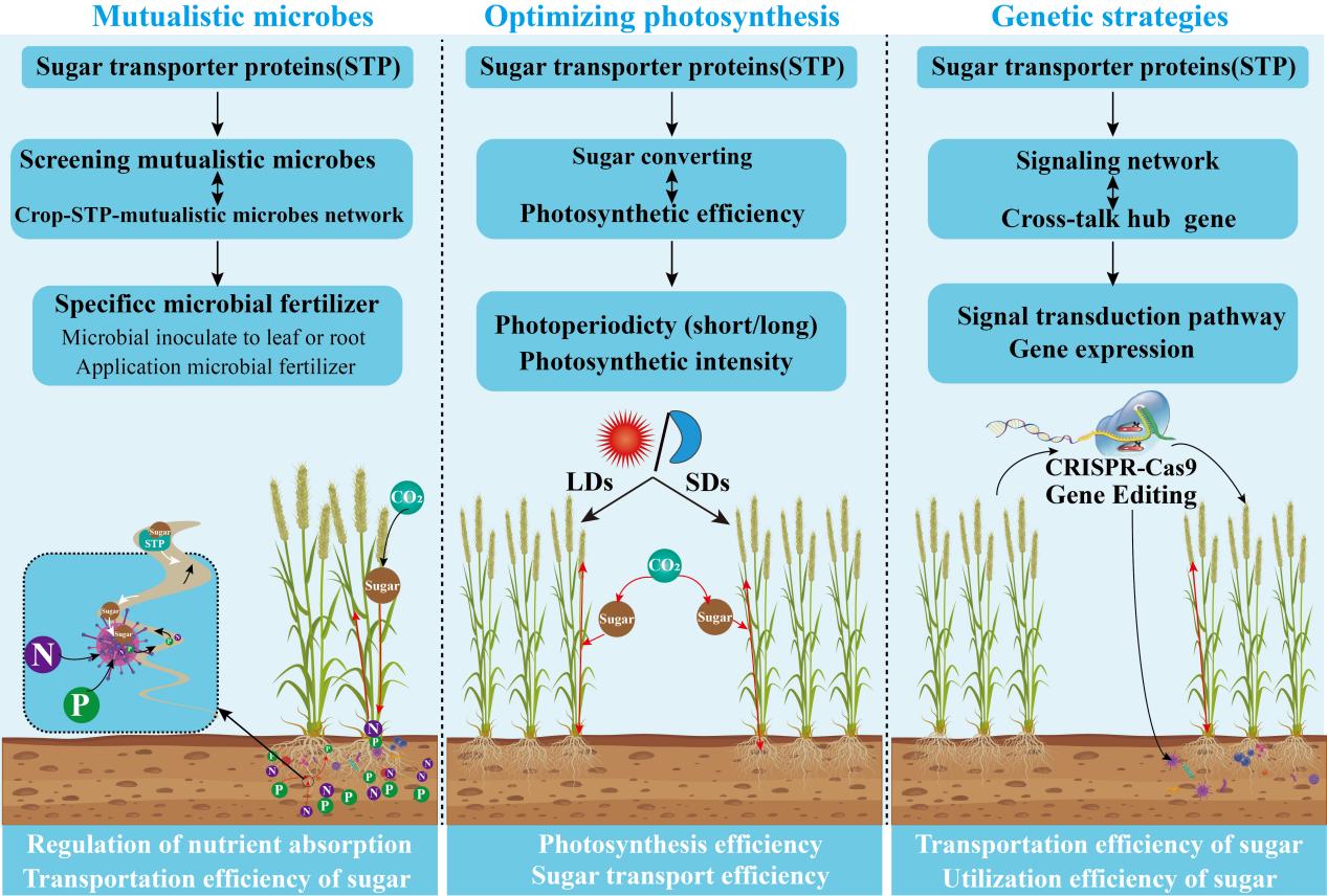糖轉(zhuǎn)運(yùn)蛋白的主要作用是源庫運(yùn)輸與調(diào)控,影響植物生長發(fā)育,響應(yīng)環(huán)境脅迫,與其他信號(hào)轉(zhuǎn)導(dǎo)通路的交互,介導(dǎo)植物-微生物的互作?;诖?,文章提出了通過糖轉(zhuǎn)運(yùn)蛋白提高作物產(chǎn)量的策略,增強(qiáng)糖轉(zhuǎn)運(yùn)蛋白與共生微生物的相互作用,提高作物對(duì)養(yǎng)分(如磷和氮)的吸收和運(yùn)輸效率,從而促進(jìn)作物生長,增加作物產(chǎn)量;建立光周期-糖轉(zhuǎn)運(yùn)蛋白模型,提高光合效率與資源分配,優(yōu)化光合作用,提高作物產(chǎn)量;借助 GWAS(全基因組關(guān)聯(lián)分析)和QTL(數(shù)量性狀位點(diǎn))定位技術(shù)及基因編輯(如 CRISPR-Cas9)相結(jié)合的技術(shù),通過遺傳策略改良作物,以達(dá)到增加作物產(chǎn)量的目的。該綜述文章為深入理解糖轉(zhuǎn)運(yùn)蛋白的作用機(jī)制提供了新思路,為提高作物產(chǎn)量提供了新的策略,對(duì)保障糧食安全具有重要參考價(jià)值和理論指導(dǎo)意義。