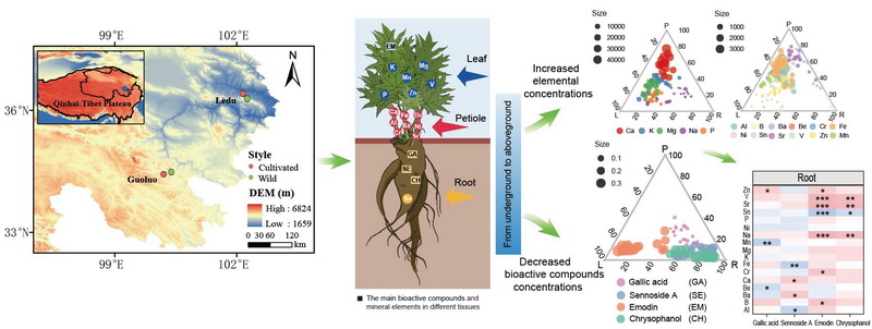唐古特大黃(Rheum tanguticum)為青藏高原特有的藥用植物,具有瀉下攻積、涼血解毒、逐瘀通經(jīng)、利濕退黃等功效,其關鍵生物活性化合物為蒽醌類、二蒽酮類以及鞣質類化合物。近年來,隨著市場需求的增加,野生資源逐漸減少,栽培唐古特大黃成為重要替代品。然而,栽培品種的品質與野生種存在顯著差異,制約了產業(yè)發(fā)展。植物微生物組和礦質元素已被證實在藥用植物品質形成中具有重要的作用。但是,野生和栽培唐古特大黃微生物組和礦質元素對關鍵生物活性化合物的影響在很大程度上仍未得到研究。