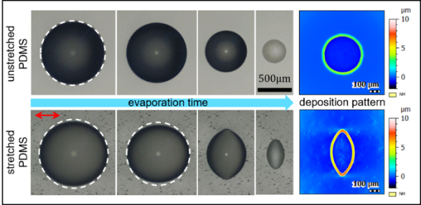 微液滴在未拉伸和拉伸的PDMS表面蒸發(fā)的過程快照和最終的沉積圖案