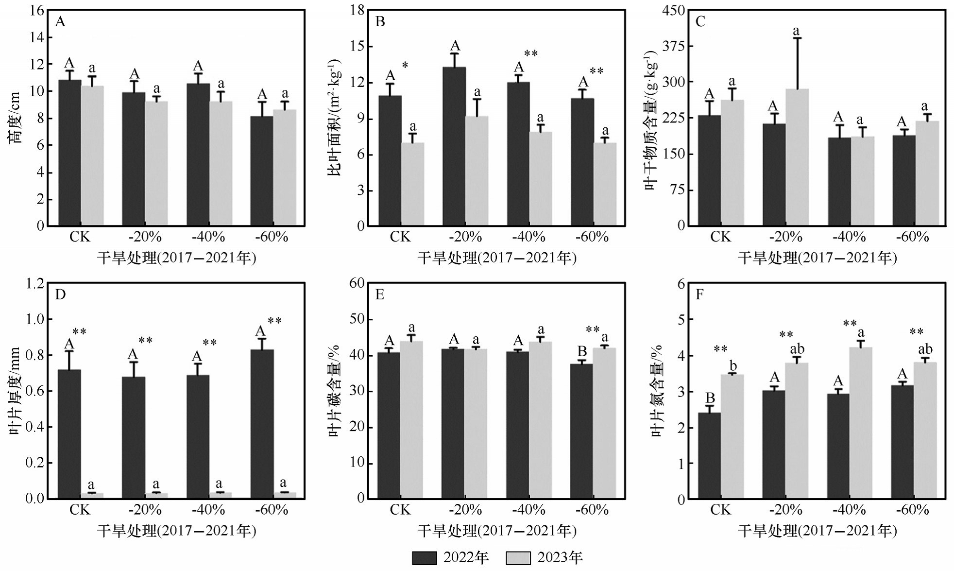 結(jié)果表明,干旱解除2年后,除減雨40%處理的物種豐富度顯著低于對(duì)照外,其他處理的物種豐富度以及所有處理下的密度、植物功能性狀、ANPP 均與對(duì)照無(wú)顯著差異,表明荒漠草原具有較強(qiáng)的恢復(fù)能力。在恢復(fù)期間,生長(zhǎng)季降水對(duì)植被恢復(fù)影響顯著,恢復(fù)第1年(2022年)生長(zhǎng)季降水量較高,減雨40%處理的葉片氮含量顯著高于對(duì)照,而所有處理的物種豐富度、密度、株高、比葉面積(SLA)、葉干物質(zhì)含量、葉片厚度(LT)和ANPP均與對(duì)照無(wú)顯著差異?;謴?fù)第2年(2023年)的生長(zhǎng)季干旱使物種豐富度、密度、SLA、LT 和ANPP顯著低于第1年,葉片碳氮含量則相反。