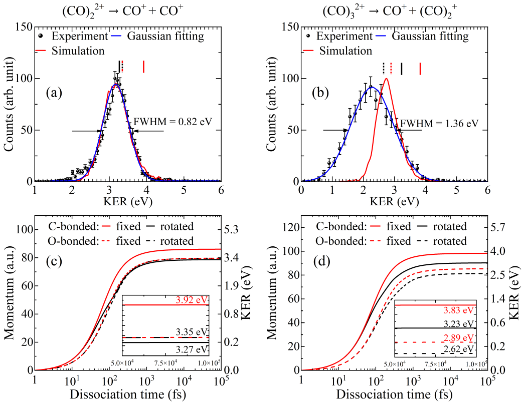 為了解釋這一實(shí)驗現(xiàn)象,科研人員在傳統(tǒng)的點(diǎn)電荷模型基礎(chǔ)上,引入了更高階的電荷分布模型,并特別考慮了CO+的電荷分布和電偶極矩。結(jié)果表明,偶極作用誘導(dǎo)了CO?碎片的轉(zhuǎn)動激發(fā)。這種能量傳遞機(jī)制充分解釋了實(shí)驗與理論之間的差異,同時揭示了庫倫爆炸過程偶極相互作用誘導(dǎo)的CO?碎化。