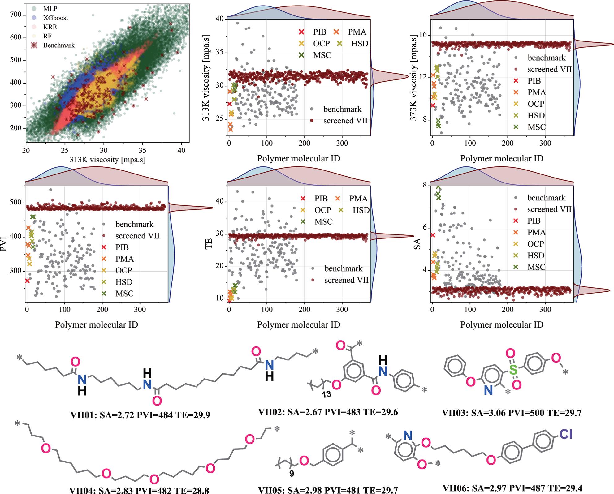 中國科學院蘭州化學物理研究所潤滑材料全國重點實驗室材料表面界面團隊長期致力于潤滑油材料的分子模擬工程和人工智能設(shè)計研究。近期,研究人員融合高通量分子動力學模擬與可解釋人工智能的自動化材料設(shè)計框架,破解了潤滑油核心添加劑——黏度指數(shù)改進劑(VII)研發(fā)難題。該研究通過自主開發(fā)的智能計算管道,僅從5類商用聚合物出發(fā),高效生成大規(guī)模VII數(shù)據(jù)集(1166組數(shù)據(jù)),并利用多目標機器學習模型從180萬候選分子中篩選出366種高性能聚合物,其粘溫性能超越現(xiàn)有商用產(chǎn)品。該工作有望為潤滑油行業(yè)節(jié)省大量實驗成本,驗證數(shù)據(jù)稀缺領(lǐng)域“計算驅(qū)動-模型解析-材料設(shè)計”的研發(fā)新范式,在高分子材料、藥物設(shè)計等領(lǐng)域具有廣泛推廣價值。