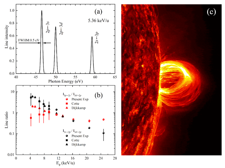 圖:(a-b) 實(shí)驗(yàn)所得N5+He電荷交換EUV譜線和線強(qiáng)比;(c) 日冕物質(zhì)拋射示意圖