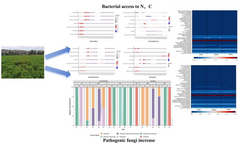 中國科學(xué)院西北高原生物研究所高原藥用資源生態(tài)保護(hù)與繁育研究團(tuán)隊(duì)以山莨菪為研究對(duì)象,基于微生物組和不同磷肥添加水平下生物堿含量的靶向測定,分析了磷肥添加對(duì)山莨菪生物堿含量的影響,揭示了土壤-微生物-植物相互作用的新機(jī)制。研究表明:磷肥通過雙重途徑對(duì)生物堿含量產(chǎn)生影響。一方面,土壤氮磷比例失調(diào)打破了土壤微生物氮循環(huán)的平衡,促使更多的細(xì)菌通過硝化-反硝化等過程獲得氮源和碳源,體現(xiàn)了磷肥添加下生物堿合成所需的氮源和能量的缺乏,干擾了植物次生代謝的資源分配;另一方面,磷肥添加重構(gòu)了微生物群落的功能布局,表現(xiàn)為低磷環(huán)境下菌根共生系統(tǒng)對(duì)碳、氮、磷的協(xié)同代謝增強(qiáng),而高磷環(huán)境下病原真菌大量繁殖阻礙了生物堿在植物體內(nèi)的合成和積累。這種微生物功能群落的生態(tài)位分化表明土壤養(yǎng)分?jǐn)_動(dòng)會(huì)改變微生物代謝網(wǎng)絡(luò),進(jìn)而調(diào)控藥用植物的次生代謝,為分析人工栽培中土壤管理、微生物功能和藥材質(zhì)量之間的耦合關(guān)系提供了理論依據(jù),明確了養(yǎng)分-微生物-代謝的級(jí)聯(lián)調(diào)控效應(yīng),為山莨菪的高效利用和價(jià)值提升提供了新見解。未來的研究應(yīng)重點(diǎn)關(guān)注基于微生物功能調(diào)控的精準(zhǔn)施肥策略,以實(shí)現(xiàn)藥用植物栽培中產(chǎn)量和品質(zhì)的協(xié)同提升。