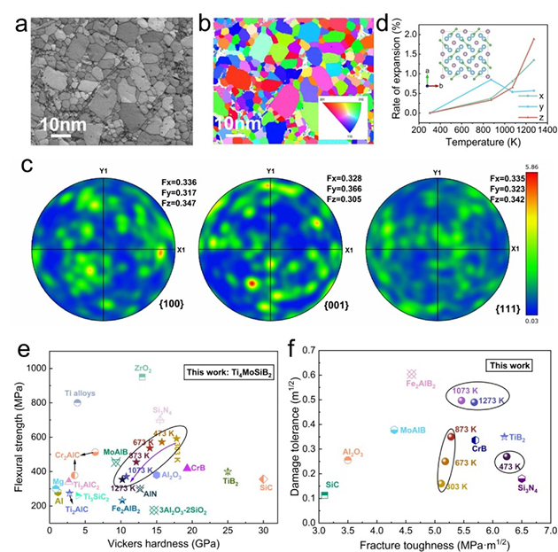 近日,中國科學(xué)院蘭州化學(xué)物理研究所蘭州潤滑材料與技術(shù)創(chuàng)新中心基于T2相通過M位合金化構(gòu)筑策略成功合成了具有面外化學(xué)有序的四元層狀過渡金屬硼化物MAB相—Ti4MoSiB2陶瓷(圖1),并系統(tǒng)研究了其在寬溫域內(nèi)的力學(xué)性能和摩擦學(xué)行為,研究人員發(fā)現(xiàn)材料原子尺度上的層狀結(jié)構(gòu)在穿晶斷裂時有效引導(dǎo)裂紋偏轉(zhuǎn),改變裂紋擴展路徑,提高低溫斷裂韌性;由于晶粒沿不同方向熱膨脹差異造成晶界的熱失配,進而改變了斷裂模式,使材料在室溫至1000℃范圍內(nèi)表現(xiàn)出優(yōu)異的綜合力學(xué)性能,同時賦予了較傳統(tǒng)陶瓷優(yōu)異的損傷容限。與DD5高溫合金對摩時在全溫度范圍內(nèi)都具有良好的抗磨性能,尤其在高溫條件下摩擦化學(xué)反應(yīng)生成的具有氧空位TiO2,一定程度上實現(xiàn)減摩效果,并實現(xiàn)了“負(fù)磨損”現(xiàn)象。這些發(fā)現(xiàn)不僅豐富了MAB相材料的基礎(chǔ)理論,也為開發(fā)新型高溫結(jié)構(gòu)功能一體化材料提供了重要指導(dǎo)。