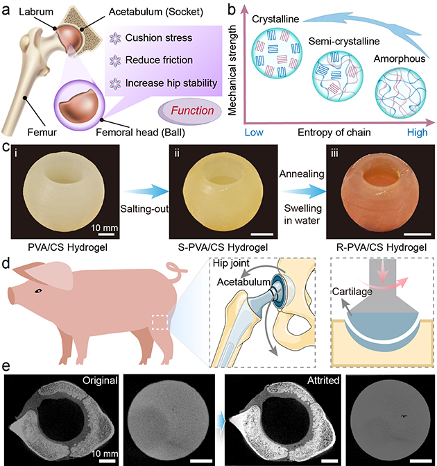 近日,團隊提出了一種低熵納米晶域網絡調控策略,即通過調節(jié)高熵非晶態(tài)和低熵晶態(tài)結構的比例來構建機械魯棒性的潤滑水凝膠。研究人員通過提高聚合物網絡中PVA大分子鏈的百分比(相對于CS的比例)來誘導PVA鏈的結晶生長,獲得了具有低熵聚合物鏈態(tài)和高結晶度的PVA/CS水凝膠,再經水化后獲得具有高機械強度和優(yōu)異潤滑性的水凝膠材料。調控優(yōu)化的水凝膠斷裂強度為7.7~17.5 MPa、彈性模量為8.6~10.6 MPa、韌性為8.8~62.1 MJ m-3、壓痕硬度為10.4~21.7 MPa,同時該水凝膠的摩擦系數(shù)可低至0.026,且具有很好的潤滑持久性,實現(xiàn)了水凝膠在機械強度和潤滑性能的雙重提升,解決了傳統(tǒng)水凝膠在高負載條件下易破裂或變形問題。此外,研究還展示了PVA/CS水凝膠在模擬人體承重組織中優(yōu)異的耐磨性,特別是在人工髖關節(jié)中的應用,為高性能人工關節(jié)潤滑材料的研發(fā)提供了新思路。