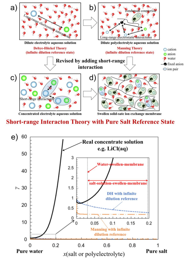 受Kenneth S. Pitzer濃電解質(zhì)溶液理論啟發(fā),研究人員認(rèn)為:離子交換膜的反離子凝聚效應(yīng)相較曼寧理論所描述的稀聚電解質(zhì)溶液要強(qiáng)的多;在純水溶脹的離子交換膜中,絕大多數(shù)的反離子處于凝聚狀態(tài),有效的屏蔽了聚合物鏈上的電荷。因此,自由離子之間的短程作用,而非長程靜電作用,才是決定性的。這點(diǎn)與忽略長程靜電作用的濃電解質(zhì)溶液理論完全一致。據(jù)此,研究人員創(chuàng)新性提出了"純水溶脹膜參考態(tài)"——首次明確區(qū)分了膜內(nèi)反離子與溶液相中反離子的標(biāo)準(zhǔn)化學(xué)勢。