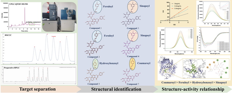中國(guó)科學(xué)院西北高原生物研究所高原藏藥資源質(zhì)控與藥理毒理評(píng)價(jià)研究團(tuán)隊(duì)通過(guò)建立UPLC-QTOF-MS/MS結(jié)合高速逆流色譜和制備液相色譜的靶向分離技術(shù),成功從青稞苗中分離得到6個(gè)以大麥黃苷和皂草黃苷為母核的不同?;揎椀难苌?。通過(guò)多維度的分子相互作用研究發(fā)現(xiàn),大麥黃苷和皂草黃苷?;?,其α-葡萄糖苷酶抑制活性均明顯提高,表現(xiàn)為香豆?;?gt;阿魏?;?gt;對(duì)羥基苯甲?;?gt;芥子酰基。6個(gè)酰化黃酮與α-葡萄糖苷酶均具有較高的結(jié)合常數(shù),主要通過(guò)范德華力和氫鍵作用占據(jù)α-葡萄糖苷酶的活性位點(diǎn)并形成穩(wěn)定的復(fù)合物,并改變關(guān)鍵氨基酸殘基和二級(jí)結(jié)構(gòu),從而降低酶催化活性。該研究為復(fù)雜天然產(chǎn)物的靶向分離純化以及?;S酮與α-葡萄糖苷酶抑制活性之間的構(gòu)效關(guān)系的研究提供了新的思路。