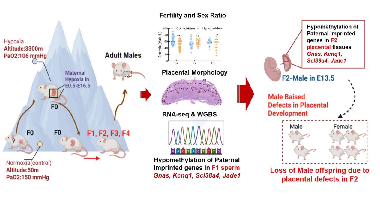 為探究母體低氧環(huán)境暴露對子代的跨代影響,中國科學院西北高原生物研究所動物生態(tài)與資源保護研究團隊建立了孕期低氧暴露小鼠模型,將經歷過孕期低氧暴露的小鼠(F0)轉運至低海拔后,出生的雄性小鼠和對照雌鼠合籠,連續(xù)飼養(yǎng)四代(F1-F4)。從20189月到 20238月,通過大量出生性別統(tǒng)計和不同發(fā)育階段的性別鑒定,發(fā)現母體孕期低氧暴露會造成F2代雄性個體顯著減少。進一步的分析發(fā)現F2雄性減少是由于在胚胎期13.5天發(fā)生的胚胎特異性丟失。雄性胚胎丟失的主要原因為胎盤形態(tài)和功能異常。研究團隊通過胎盤轉錄組和全基因組DNA甲基化測序聯(lián)合分析,發(fā)現父源印記基因Slc38a4Gnas,Jade1 Kcnq1表達異常。隨后,通過對F1代小鼠成熟精子與F2代雄性胎盤全基因組DNA甲基化進行聯(lián)合分析,結果發(fā)現以上印記基因DNA甲基化模式高度相似。這說明經歷胚胎期低氧的F1代雄性小鼠的精子存在甲基化異常,并且可以進一步影響F2雄性個體生長發(fā)育進而導致性別比例異常。該工作系統(tǒng)地揭示母體低氧暴露對F1F2代發(fā)育影響的跨代遺傳機制,為深入理解高原低氧暴露的生殖和健康風險提供了新的表型數據。