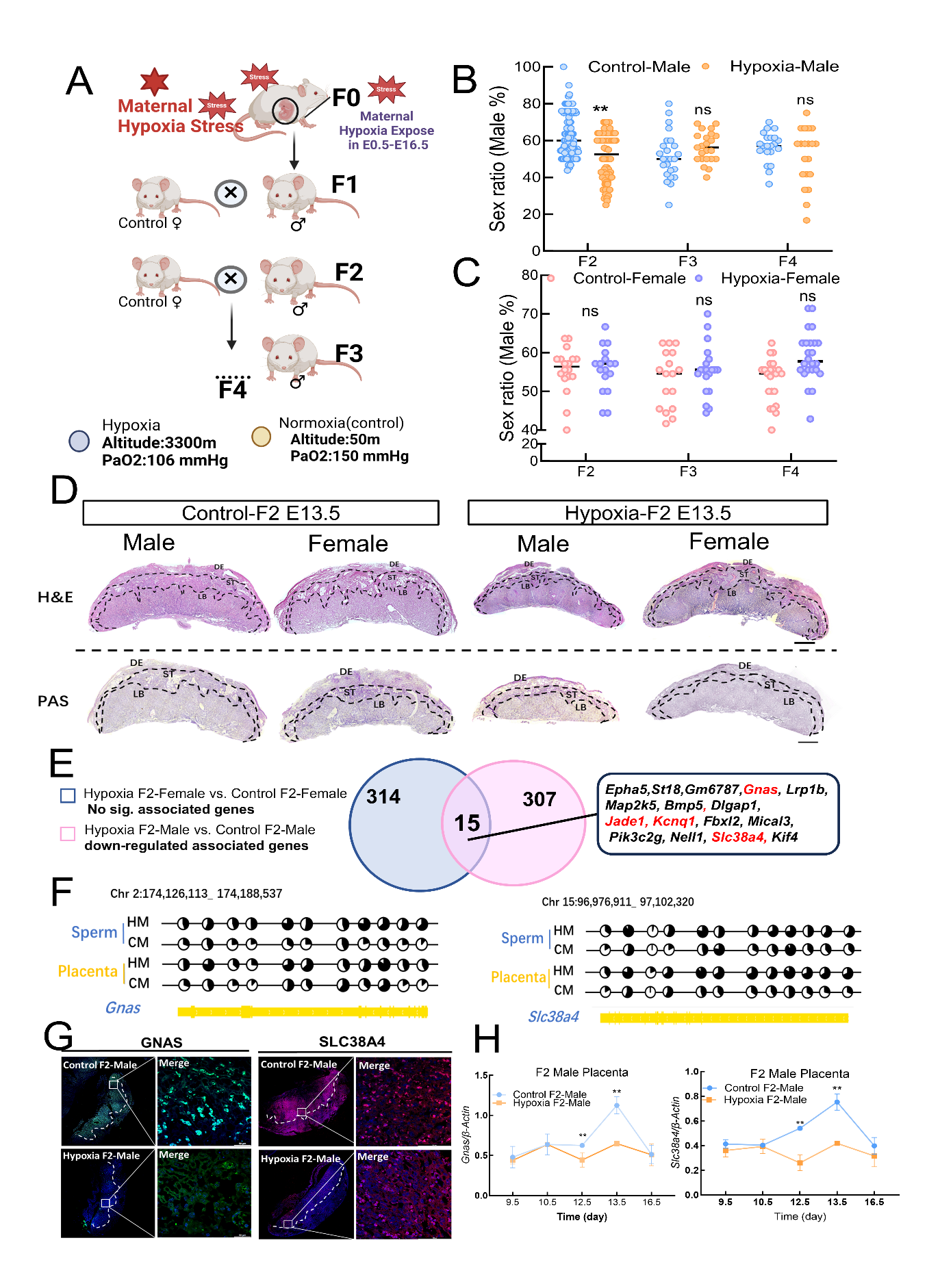 文章代表圖片A:低氧暴露及傳代實驗模式圖;BF2-F4代雄性組胚胎出生性別比例統(tǒng)計;CF2-F4代雌性組胚胎出生性別比例統(tǒng)計;DHE染色分析F2E13.5不同性別小鼠胎盤形態(tài);EWGBS與轉錄組聯(lián)合分析篩選差異父源印記基因;F候選基因在F1精子和F2胎盤中甲基化位點的甲基化水平;G候選基因在E13.5胎盤中的蛋白表達免疫熒光染色;H候選基因在F9.5-E16.5胎盤中的基因表達變化趨勢。