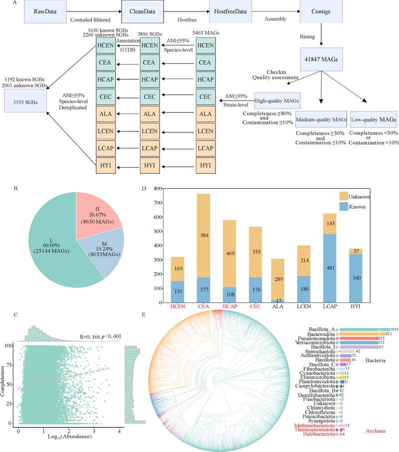 研究采集了青藏高原地區(qū)多種鹿科動(dòng)物的糞便樣本,并結(jié)合公共數(shù)據(jù)庫(kù)中平原地區(qū)鹿科動(dòng)物樣本進(jìn)行分析,通過(guò)宏基因組組裝共獲得了41,847個(gè)宏基因組組裝基因組(MAGs),并構(gòu)建了3,193個(gè)高質(zhì)量物種水平基因組,建立了目前最為系統(tǒng)、全面的鹿科動(dòng)物腸道微生物組數(shù)據(jù)庫(kù)。這是國(guó)內(nèi)外首個(gè)基于多物種、大規(guī)模宏基因組分析的鹿科動(dòng)物腸道微生物資源庫(kù),為后續(xù)功能挖掘、微生物資源利用及瀕危物種保護(hù)提供了堅(jiān)實(shí)的數(shù)據(jù)基礎(chǔ)。