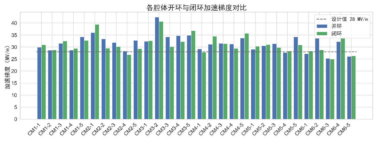 HIAF注入器的超導(dǎo)加速段由6套QWR007型和11套HWR015型加速單元組成。團(tuán)隊(duì)自2024年6月啟動(dòng)QWR型超導(dǎo)腔批量化生產(chǎn),并于2025年6月順利完成了本次在線運(yùn)行測試。在7?ms脈沖寬度、5?Hz重復(fù)頻率的注入器設(shè)計(jì)工況下,測試平均加速梯度對應(yīng)的峰值表面場達(dá)到31.1?MV/m,較設(shè)計(jì)值28.0?MV/m高出11%,幅度穩(wěn)定性優(yōu)于0.04%,相位抖動(dòng)控制在0.08°以內(nèi),滿足運(yùn)行要求。