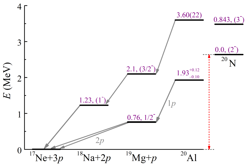 進(jìn)一步的研究表明,鋁-20基態(tài)通過級聯(lián)的質(zhì)子—雙質(zhì)子發(fā)射的兩步過程進(jìn)行衰變。作為中間態(tài)的鎂-19基態(tài)具有雙質(zhì)子放射性,它通過同時發(fā)射兩個質(zhì)子衰變?yōu)槟?/span>-17。鋁-20是實驗上發(fā)現(xiàn)的首例具有“子核”雙質(zhì)子放射性的三質(zhì)子發(fā)射核。